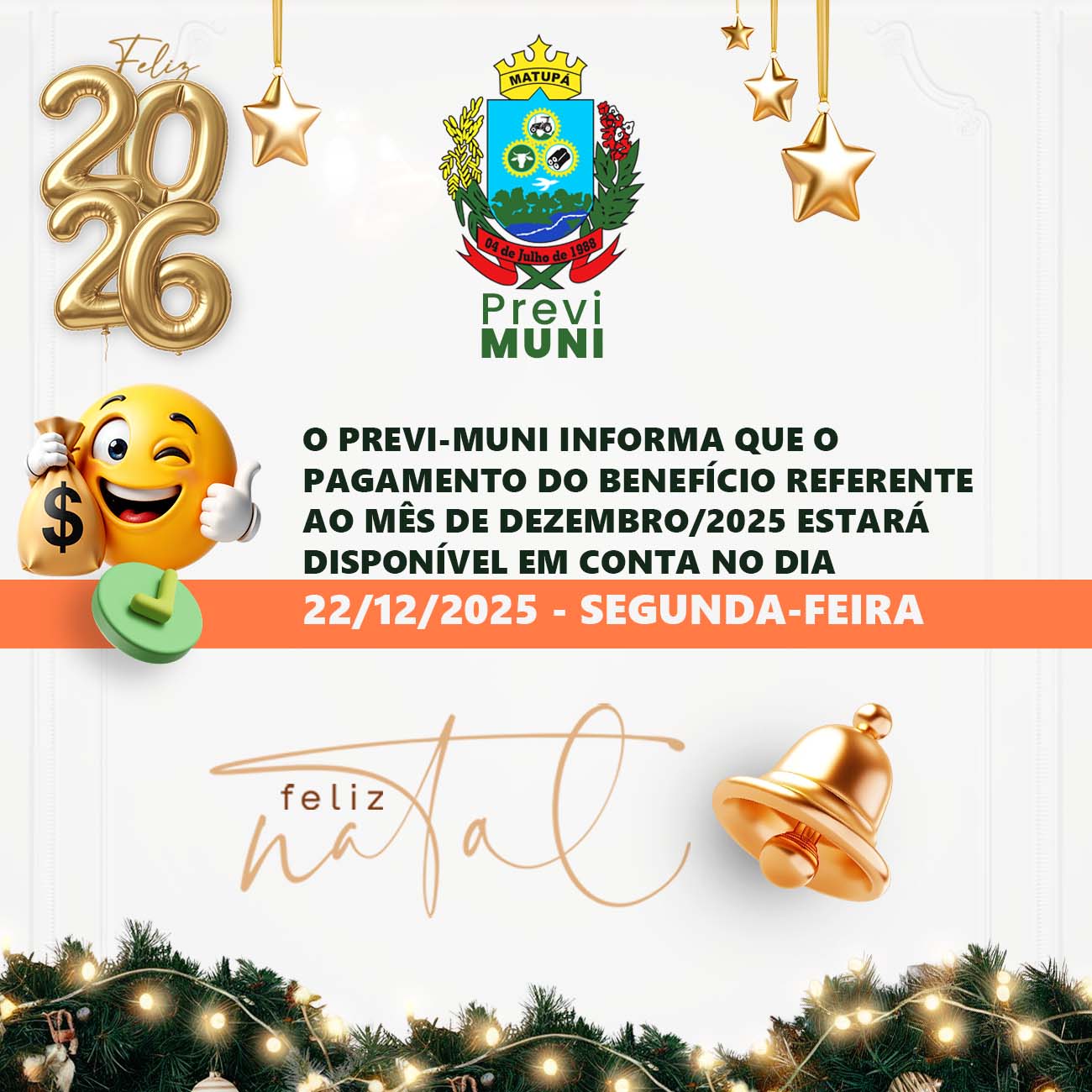 O Previ-Muni de Matupá informa que o pagamento do benefício referente ao mês de dezembro de 2025 será efetuado nesta segunda-feira, dia 22, reafirmando o compromisso com os servidores municipais em manter os pagamentos rigorosamente em dia, sempre dentro do próprio mês, conforme o planejamento previdenciário estabelecido.